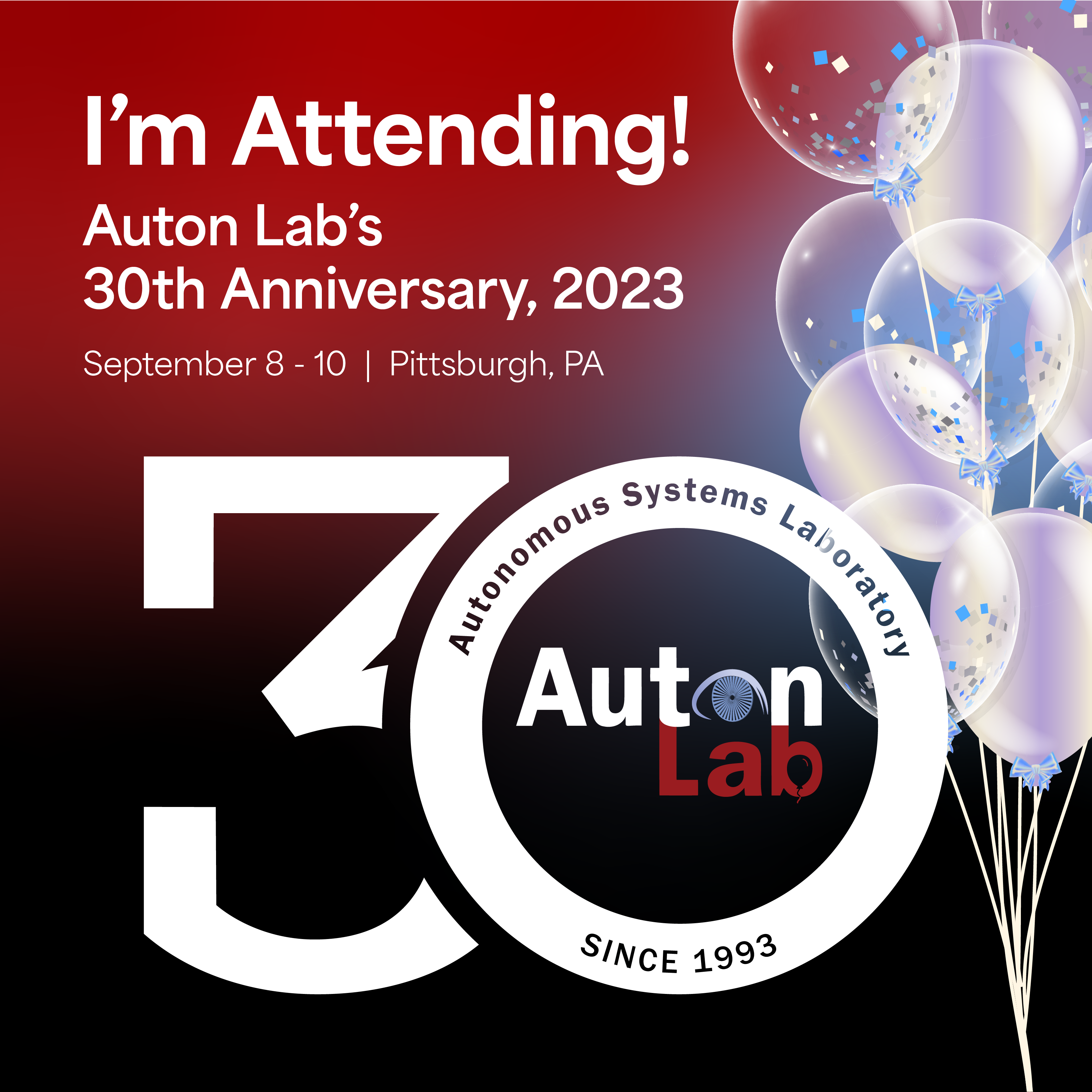 The Auton Lab is turning 30 years old! Calling all alumni, sponsors, collaborators and friends - Please join us for a weekend of activities from September 8th to September 10th, 2023. RSVP today on our 30th Anniversary website.